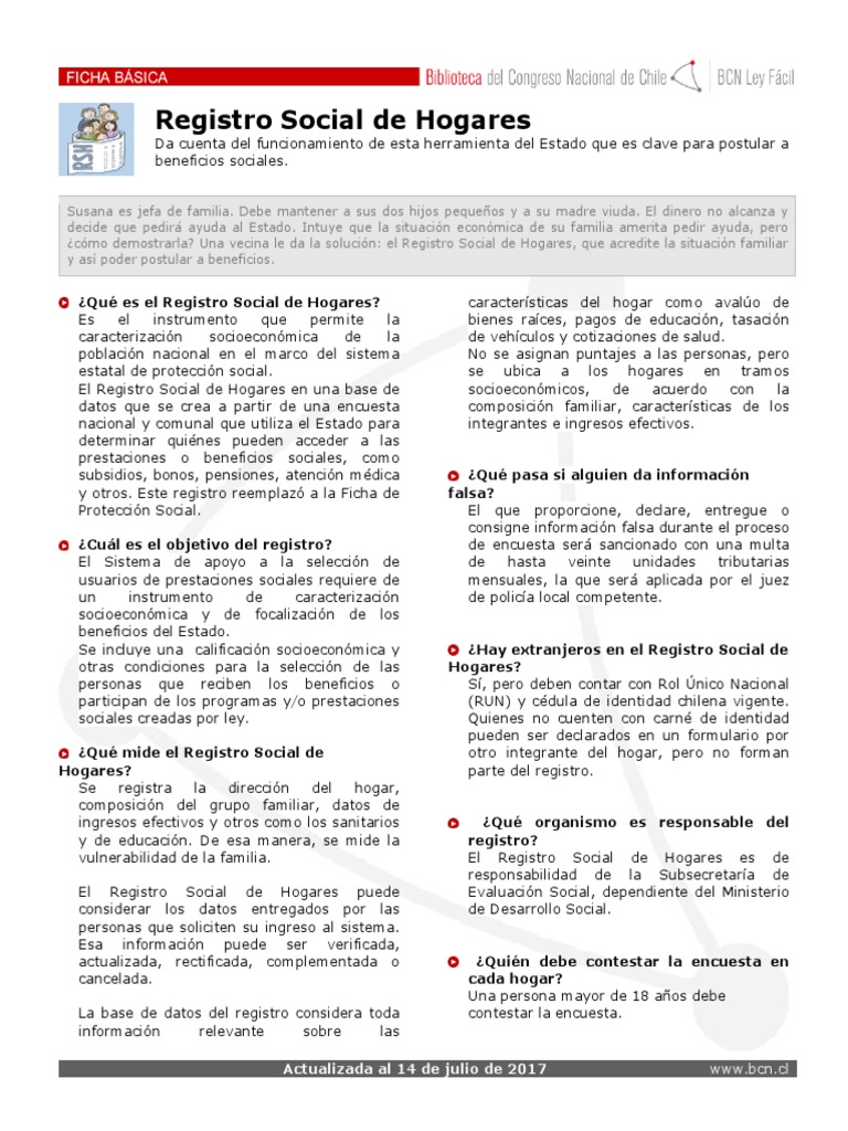 Se trata del sistema utilizado actualmente para determinar quienes pertenecen al tramo más pobre de la población, y sirve se construye con la información adquirida de la ficha social declarada por las personas integrantes de un hogar y la base proporcionada por las. Clasificación socieconómica del registro social de hogares. El registro social de hogares (antes conocido como ficha de protección social) es una base de datos que tiene la información de las personas y hogares que se hayan incorporado. Se registra la dirección del hogar, composición del grupo familiar, datos de ingresos efectivos y otros. Teniendo tu registro social de hogares, podrás postular a diversos beneficios sociales, como son los bonos y subsidios del estado.